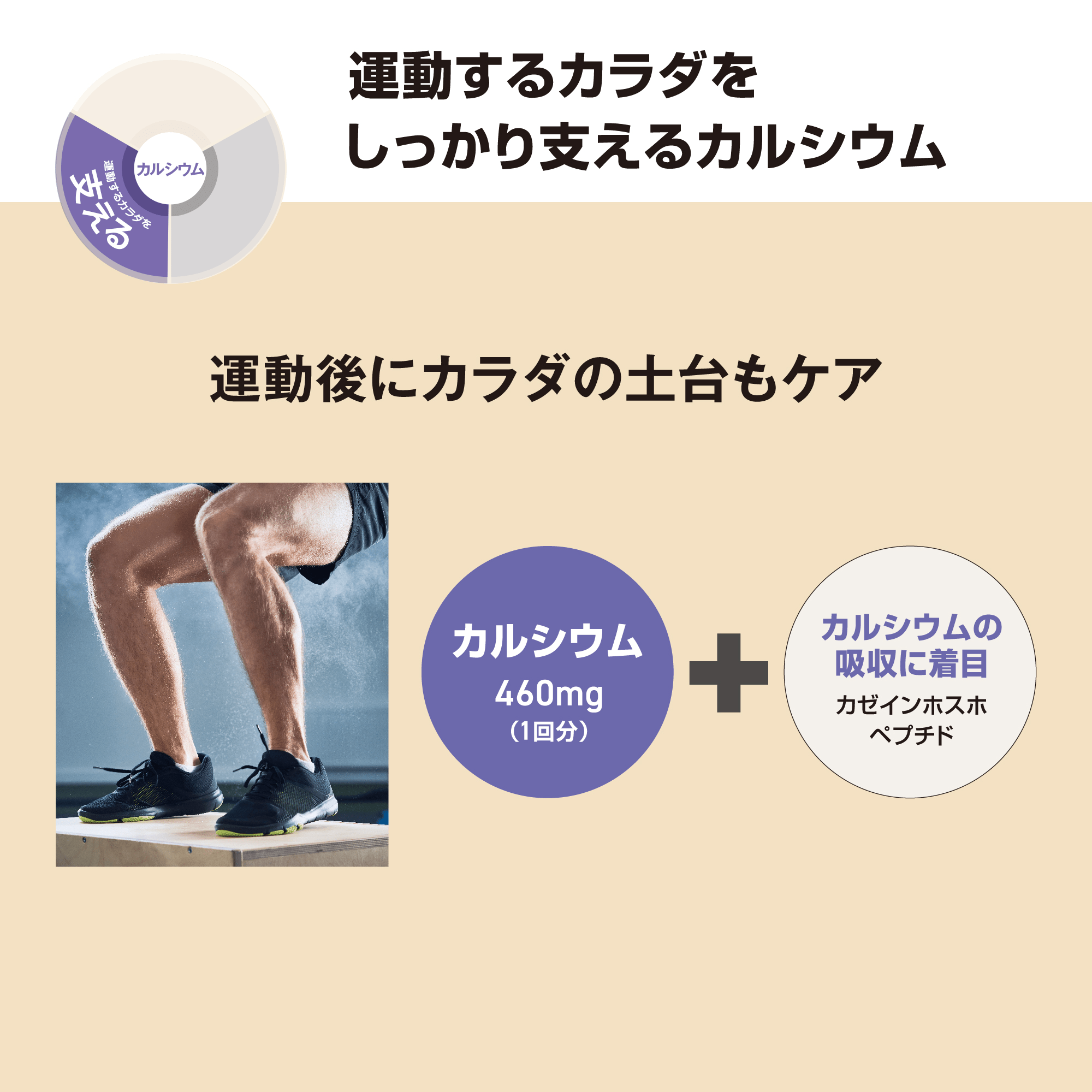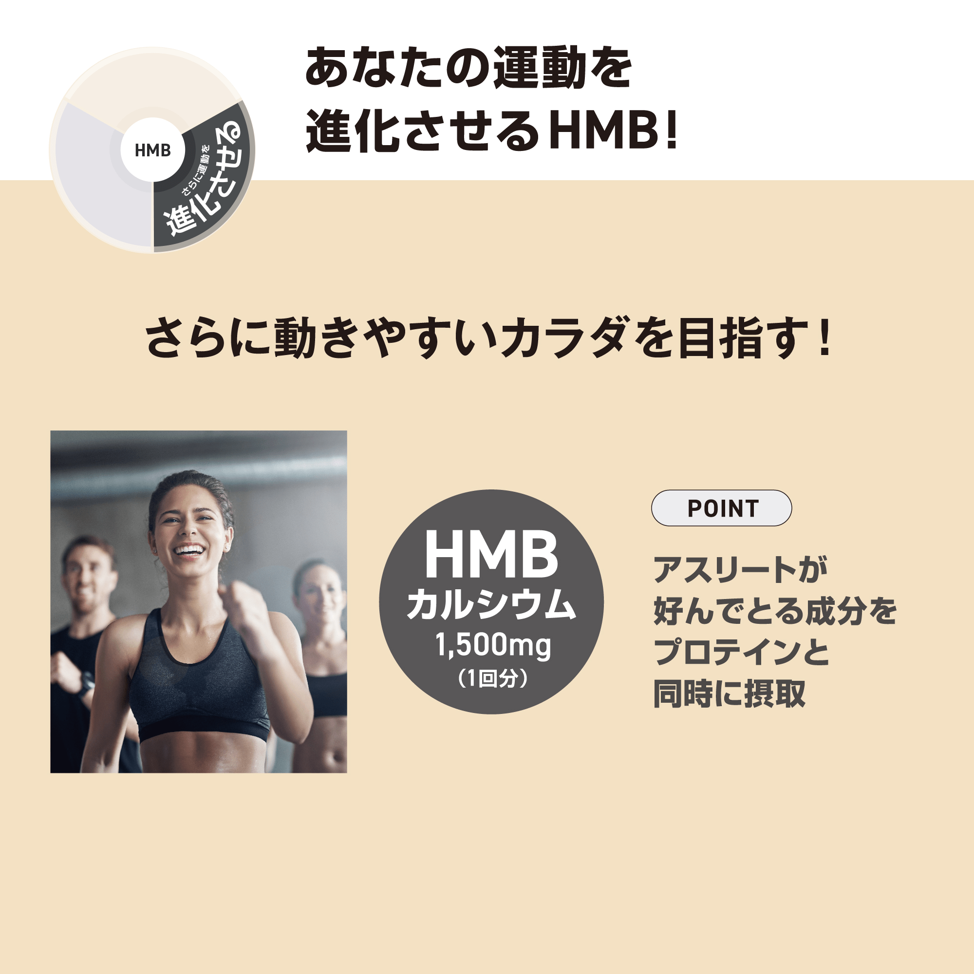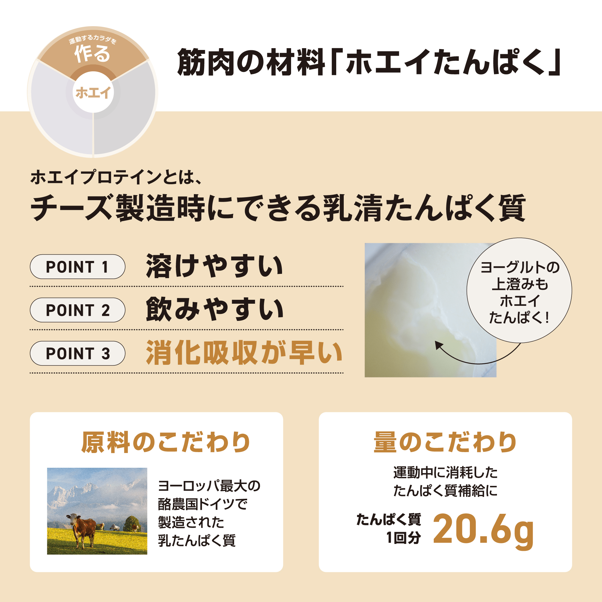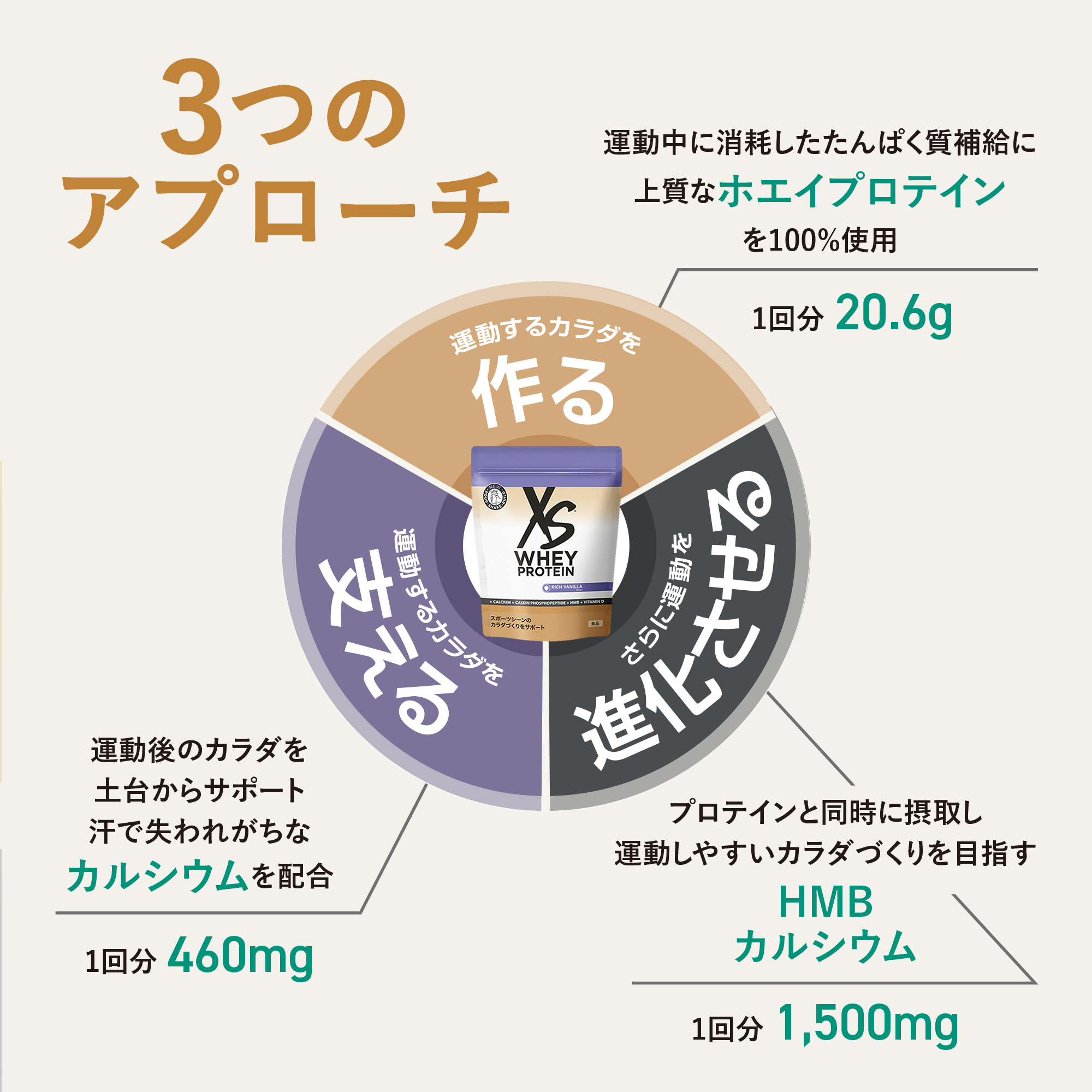 原料・たんぱく質の量にこだわったホエイプロテインで運動するためのカラダを「作る」、 カルシウム配合でしっかりカラダを「支える」、HMB カルシウム配合でさらに動きやすいカラダを目指し、あなたの運動を「進化」させます。